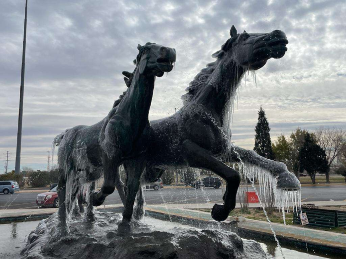 La escultura emblemática de Juárez de ‘Los Indomables’, son también el termómetro de las congelantes temperaturas que registra la ciudad, al quedar cubiertas de hielo.
