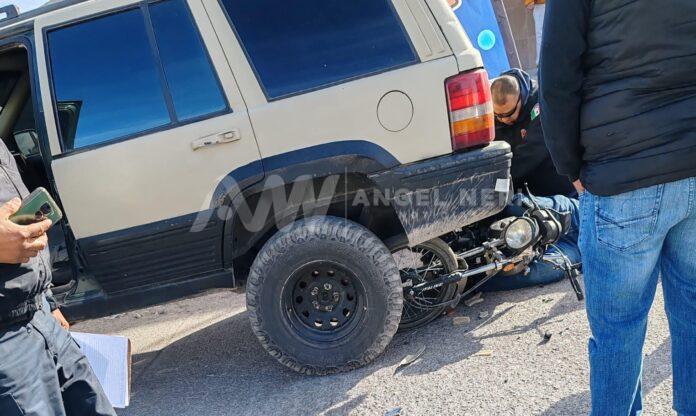 Los testigos aseguran que el joven de la motocicleta color gris con negro intentaba rebasar y derrapó hasta quedar bajo la camioneta de la marca Jeep, línea Cherokee, color café modelo atrasado.