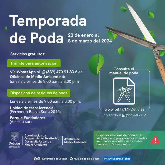 El Gobierno Municipal de Delicias, encabezado por el alcalde Jesús Valenciano García, anunció que este 22 de enero inició oficialmente la temporada de poda en el municipio con la que podrán realizar las modificaciones y mantenimiento a los árboles que hay en sus propiedades, según informó el jefe de Medio Ambiente, Juan Carlos Torrecillas López.