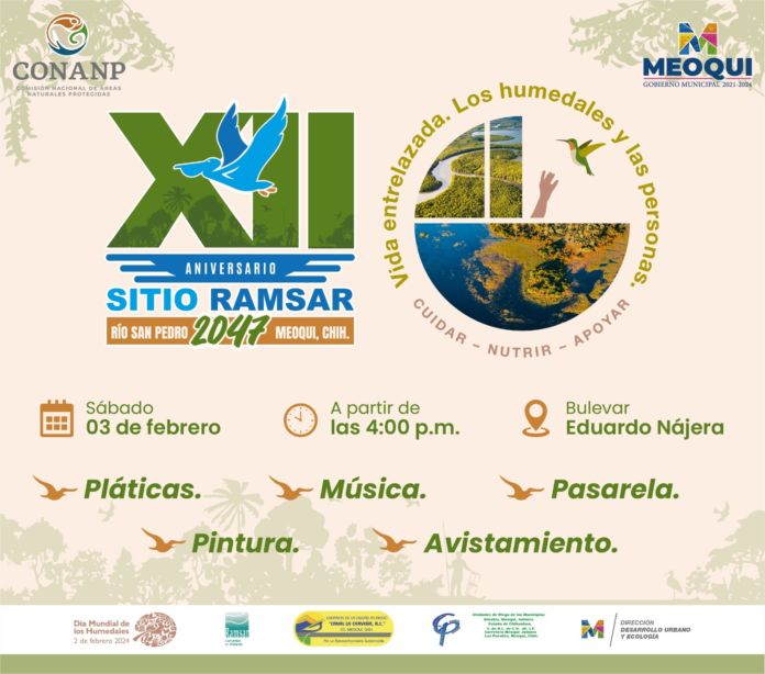 Con un recorrido por el Rio San Pedro hasta un gran evento con presentaciones artísticas y conferencias de concientización, en Meoqui se llevará a cabo el tradicional “Festival de las Aves”, con motivo de la conmemoración del Día Internacional de los Humedales y el XII Aniversario del Sitio RAMSAR 2047 Rio San Pedro Meoqui, los días viernes 2 y sábado 3 de febrero.