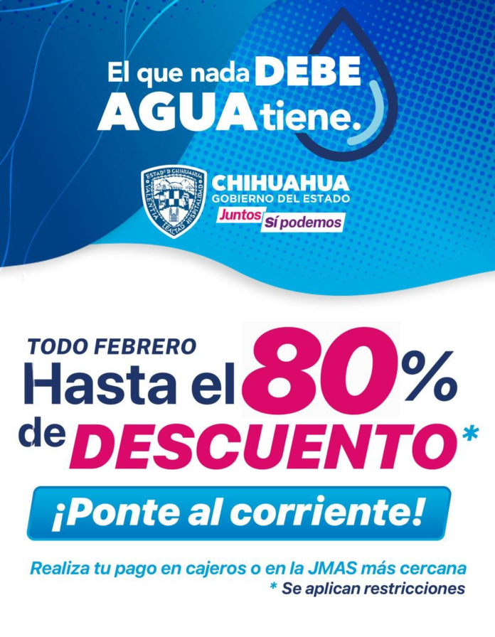 La Junta Municipal de Agua y Saneamiento de Delicias anunció la continuidad del programa «El que nada debe, agua tiene», el cual ofrece descuentos de hasta el 80% en los pagos del servicio de agua durante el mes de febrero.