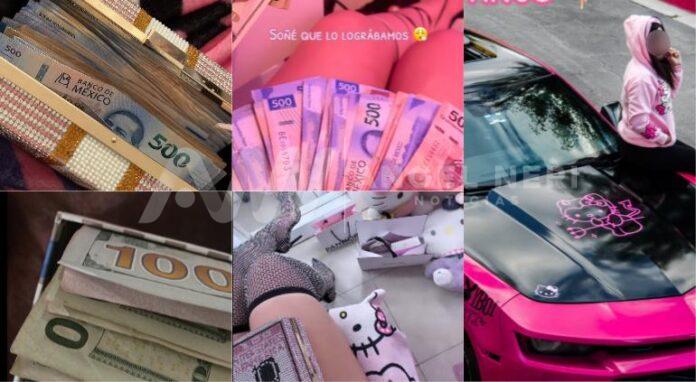 En los videos compartidos en sus redes se pueden apreciar fajos con billetes de 500 pesos, así como de 100 dólares, los cuales presumía dentro de una llamativa bolsa con brillantes y al lado un arma de fuego.
