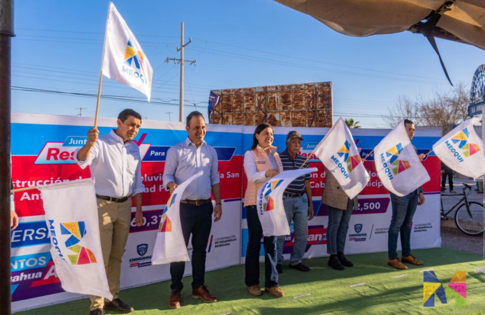 La alcaldesa Miriam Soto, en compañía de Jorge Soto, coordinador de Desarrollo Municipal de Gobierno del Estado, José Luis Cisneros, Directoe Ejecutivo de la JMAS Meoqui y vecinos de la comunidad dieron el banderazo simbólico de arranque de los trabajos en el Proyecto Integral Anti Inundaciones con la pavimentación de la Calle 16 de la Col. San Antonio.