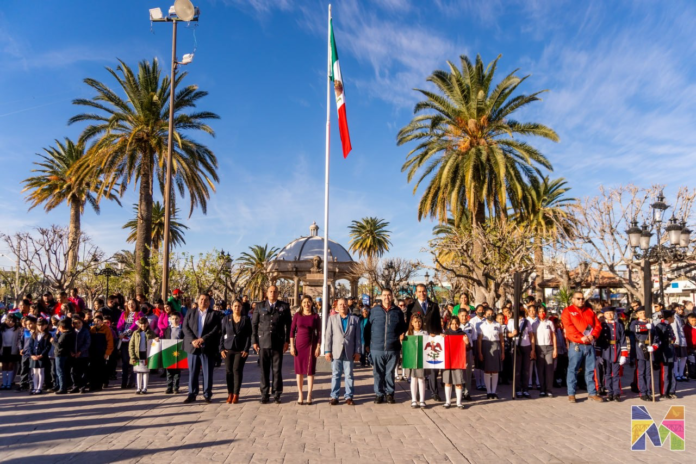 Este sábado 24 de febrero, más de 250 alumnos de tercero de primaria juraron bandera en la explanada de Presidencia Municipal de Meoqui, evento cívico que fue encabezado por la alcaldesa Miriam Soto, quien destacó la importancia de inculcar desde temprana edad la importancia de los símbolos patrios, mismos que nos dan identidad como nación.