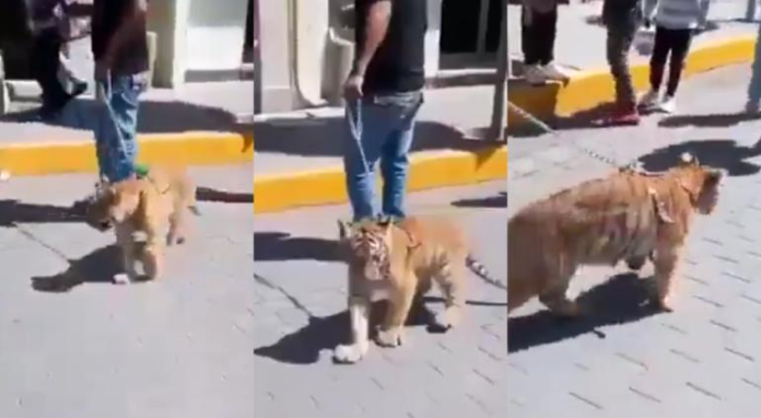 El suceso ha generado sorpresa y asombro entre la comunidad y en las imágenes compartidas en redes sociales se observa cómo el hombre pasea al cachorro de tigre.