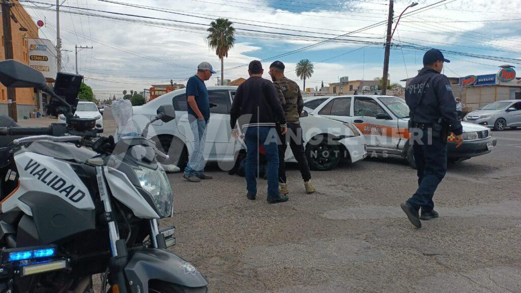 El otro auto involucrado es de la marca Nissan, tipo Sentra, color blanco, el cual circulaba de poniente a oriente sobre la calle central, mientras que el taxi se desplazaba sobre la avenida 1a Sur de sur a norte, omitiendo el señalamiento de alto, provocando ser chocado, resultando lesionada la pasajera del auto de alquiler.