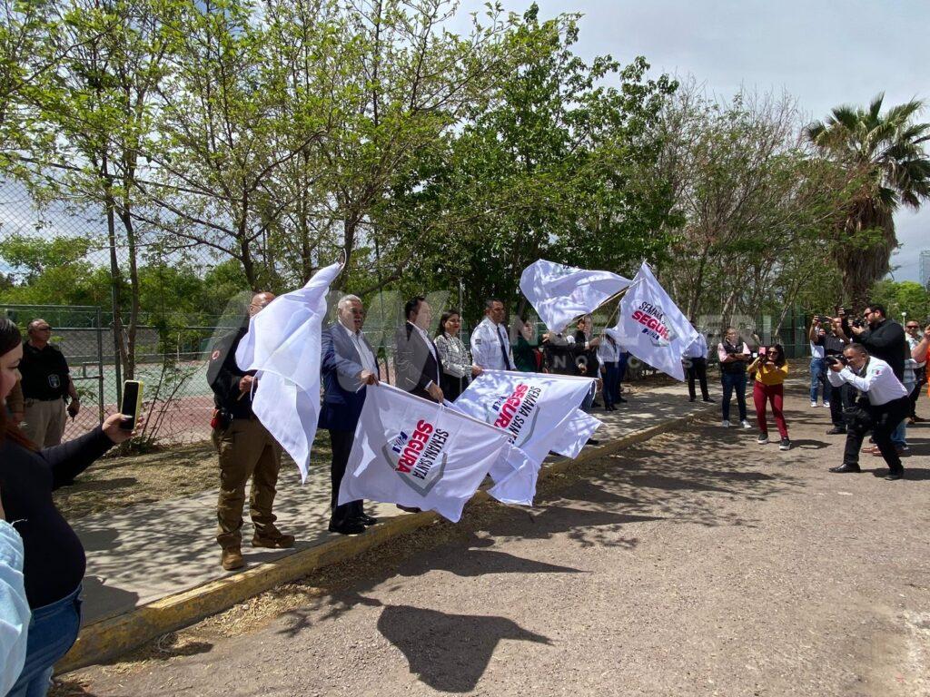 las inmediaciones del parque Fundadores, fue la sede de dicha ceremonia que fue encabezado por el Secretario de Seguridad Pública del Estado, Gilberto Loya; junto a él, los alcaldes de Delicias, Jesús Valenciano; de Meoqui, Miriam Soto; y de Saucillo, Aidé López de Anda.