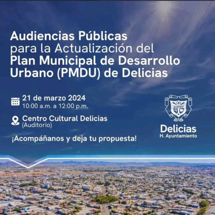 El Gobierno Municipal de Delicias, invita a la ciudadanía a participar en dos audiencias públicas con las que se recabará la opinión de los delicieenses para la actualización del Plan Municipal de Desarrollo Urbano.