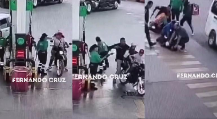 Ella comenzó a bañarlos con gasolina magna y a tratar de golpearlos hasta que llegó un policía y les apuntó con su arma, al mismo tiempo que llegaron otros clientes y comenzaron a golpearlos en repetidas ocasiones.