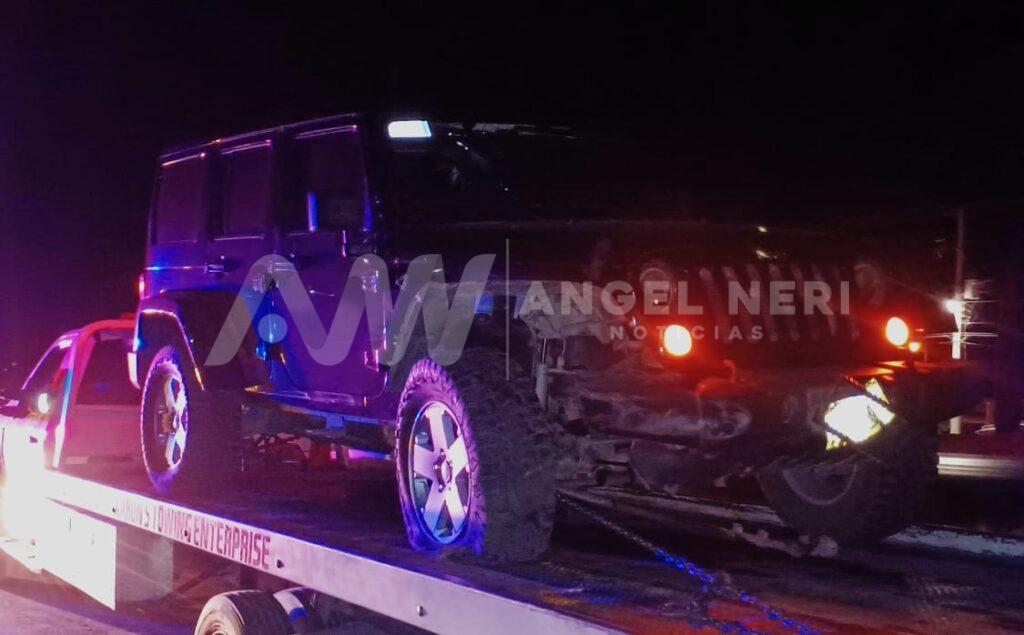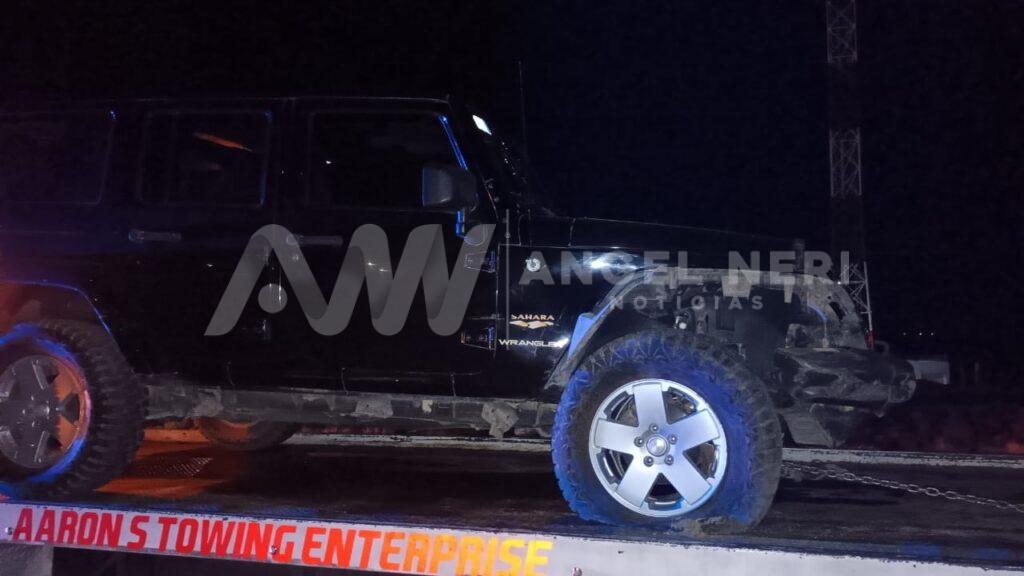 Se trata de una camioneta Jeep Wrangler Sahara, color negra, con matrículas de estado de Chihuahua, la cual quedó con la parte derecha frontal con fuertes daños, por lo que fue necesario que acudiera una grúa para retirarla del lugar, mientras tanto, la Guardia Nacional redujo el flujo vehicular debidamente señalizado para permitir el retiro del vehículo siniestrado.