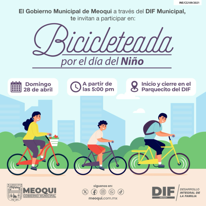 El Gobierno de Meoqui a través del DIF Municipal, estará realizando una bicicleteada, la cual se llevará a cabo afuera de las instalaciones del parque del DIF, este próximo domingo 28 de abril a partir de las 5 de la tarde.