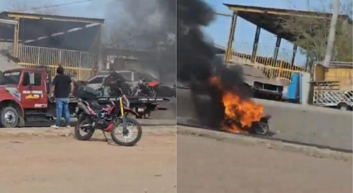 A través de redes sociales difundieron la grabación de una motocicleta incendiada en calles de Culiacán durante un retén.