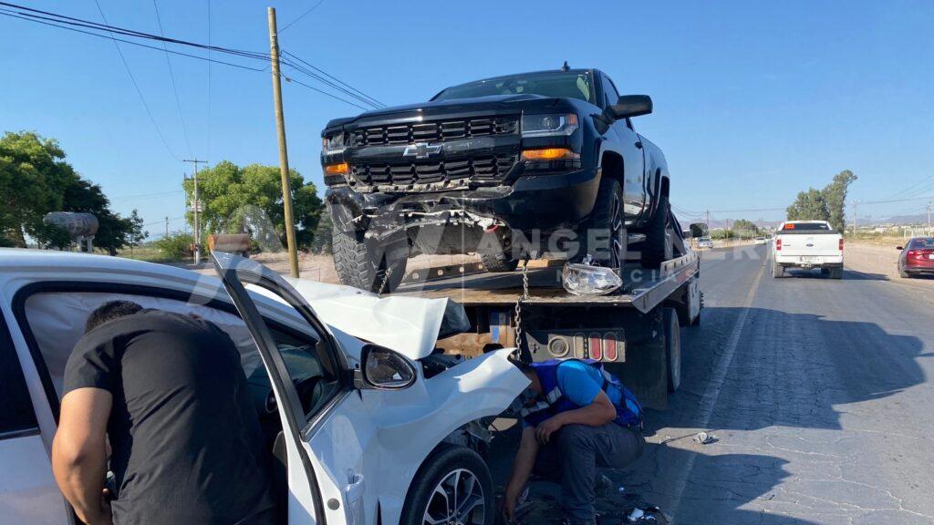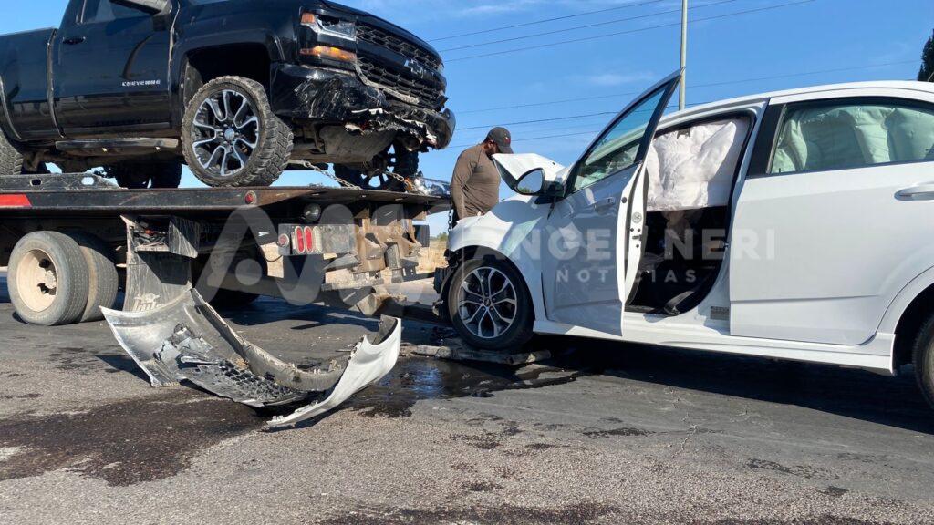 Ahí un vehículo compacto color blanco, así como una pickup color negro, se impactaron de frente o ocasionando bastantes daños materiales en ambos vehículos.