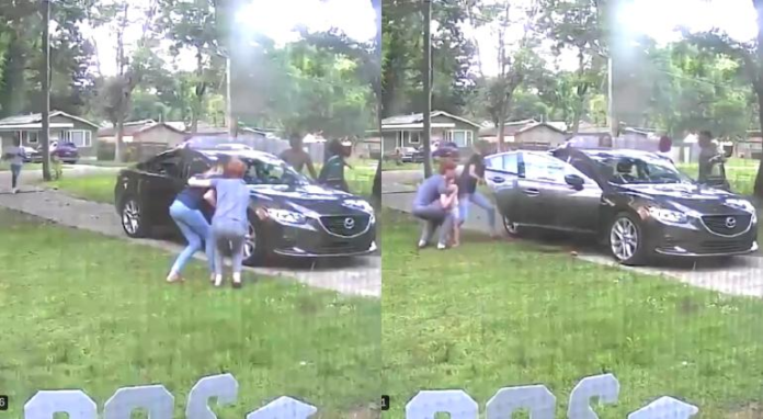 Los hechos ocurrieron en Jackson, Mississippi, Estados Unidos, una cámara de seguridad muestra a una mujer y a un adolescente a punto de subir a un carro, cuando de la nada, se ve que ambos se agachan.