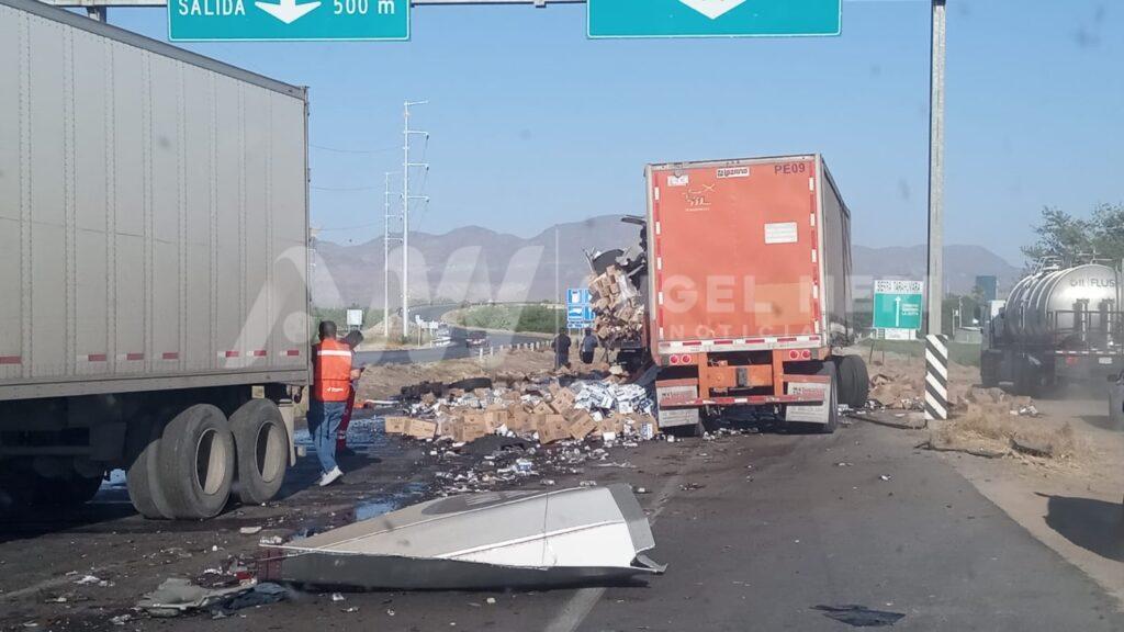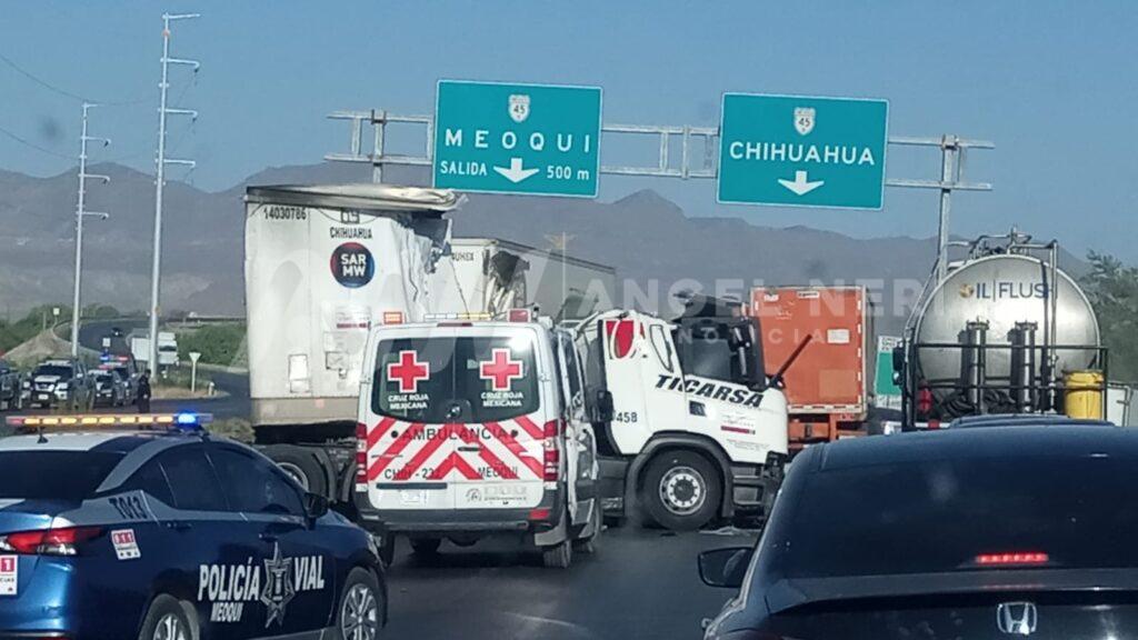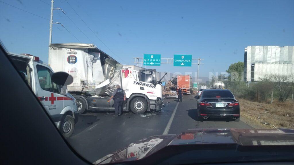 Fotos que circulan en grupos de emergencias regionales muestran las impactantes imágenes del accidente entre dos tráiler ocurrido en la carretera federal, a la altura del Hotel Kavia, en el municipio de Meoqui.