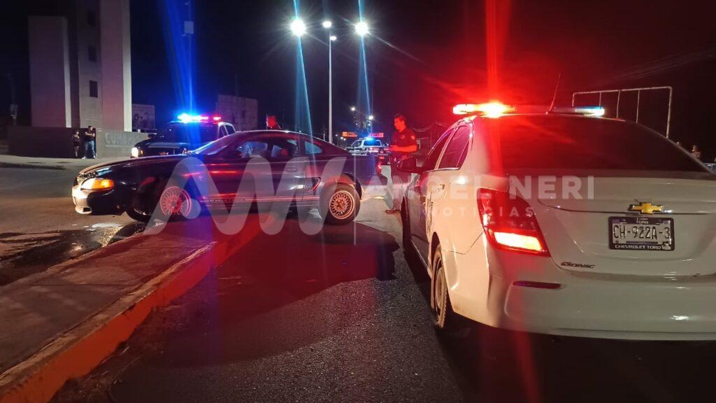 Esta madrugada de domingo, un accidente vial dejó a un vehículo tipo Mustang, color azul, varado sobre el camellón central de la prolongación de la avenida Fernando Baeza, en la entrada del fraccionamiento Cumbres del Deporte, sufriendo daños significativos en la parte del motor y el neumático frontal izquierdo tras el aparatoso percance.