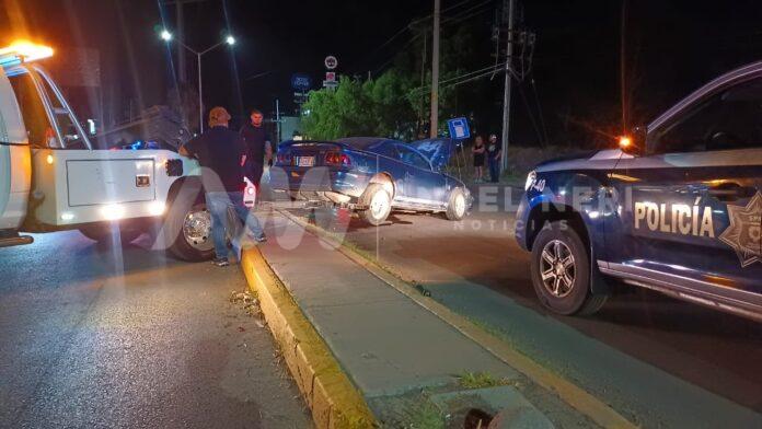 Esta madrugada de domingo, un accidente vial dejó a un vehículo tipo Mustang, color azul, varado sobre el camellón central de la prolongación de la avenida Fernando Baeza, en la entrada del fraccionamiento Cumbres del Deporte, sufriendo daños significativos en la parte del motor y el neumático frontal izquierdo tras el aparatoso percance.