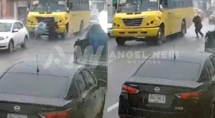 En ese momento, un hombre comienza a cruzar la calle esquivando los carros que se encuentran detenidos, entre ellos un camión de pasajeros amarillo ya que lleva a sus hijas a la escuela.