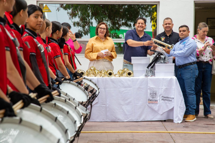 Con la finalidad de seguir abonando a la creación de generaciones fuertes a través de actividades extra escolares, Estacionómetros Delicias realizó la entrega de equipo para la banda de guerra que consta de trompetas y calzado con un monto de inversión aproximando de 25 mil pesos.