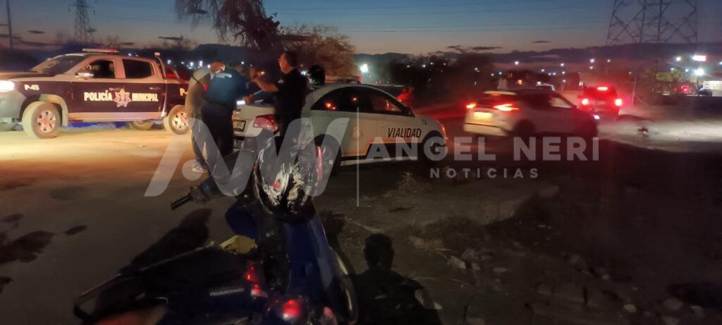 Un accidente de tránsito se registró esta noche en el cruce de la avenida de Las Moras y la entrada del fraccionamiento Cumbres del Deporte, donde una patrulla de seguridad pública municipal impactó a un motociclista al tratar de incorporarse a la mencionada avenida.