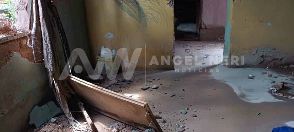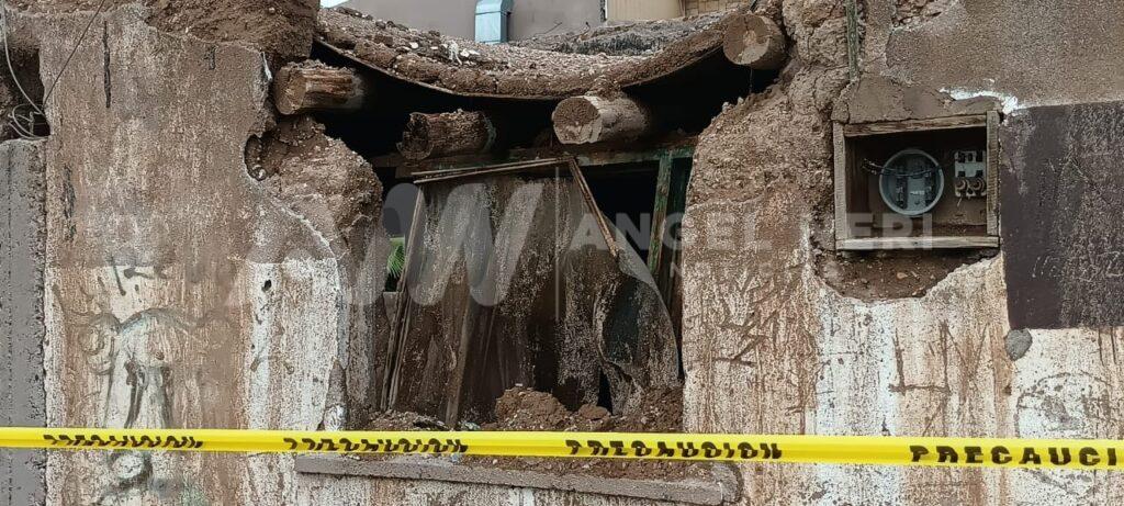 Parte del techo de una vivienda en la colonia Loma de Pérez colapsado y otra parte de este a punto de colapsar, se cuenta entre los estragos dejados por la intensa precipitación pluvial de este lunes, lo que además de representar daños, también representa un riesgo, pues si bien la vivienda está deshabitada, vecinos refieren que hay personas indigentes que pernoctan ahí.