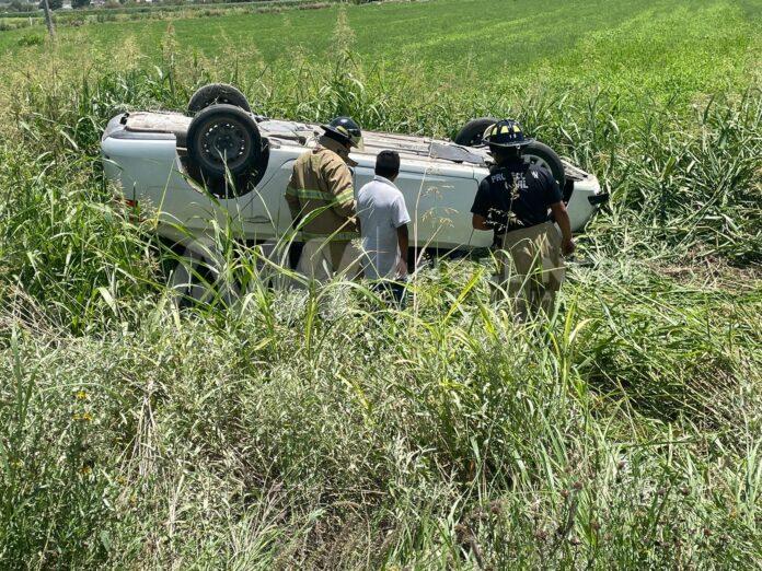 Un accidente automovilístico tipo volcadura se registró sobre la carretera de Delicias a Meoqui, poco antes de llegar al entronque con la colonia Terrazas, conocido como El Salado, alrededor de las 12:30 del medio día de este martes, cuando un vehículo de la marca Sentra, modelo 2013 color blanco, perdió el control y se volcó hacia su lado derecho mientras circulaba en sentido sur-norte.