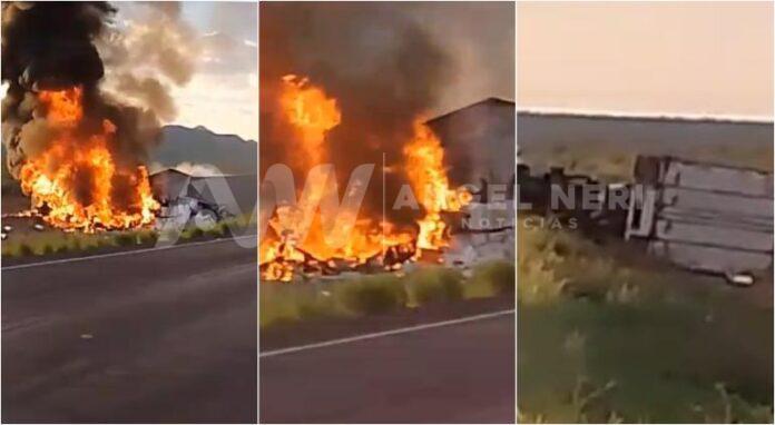 Este incidente se presentó a la altura del kilómetro 36 de dicha vía y captaron cómo las dos pesadas unidades quedaron fuera de la cinta asfáltica. La cabina de uno de ellos se encontraba completamente en llamas.
