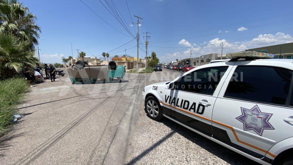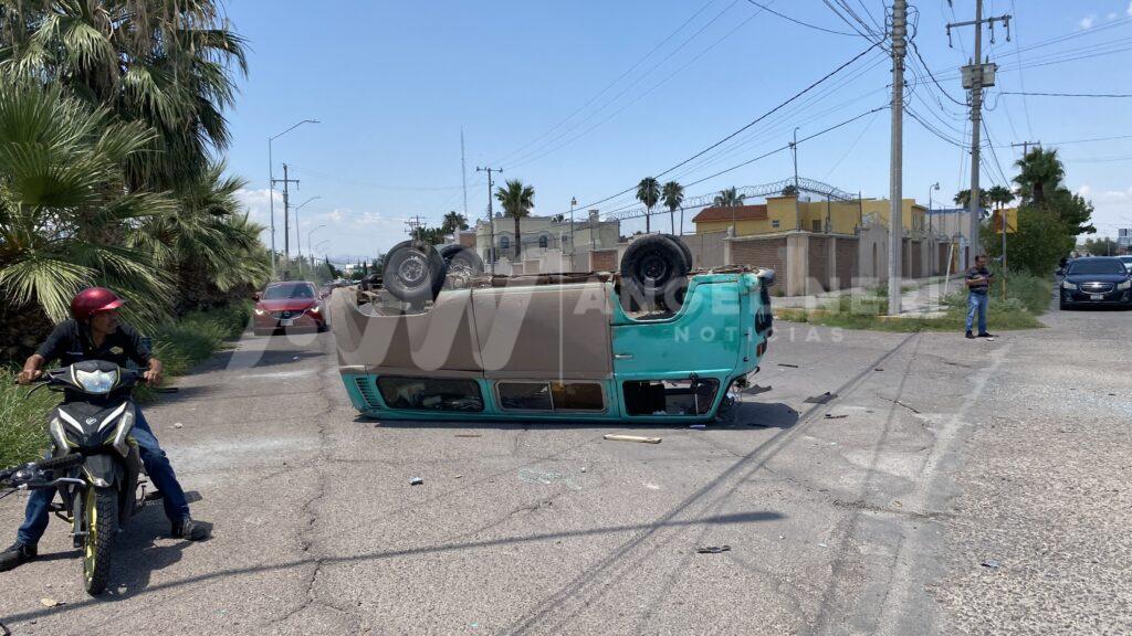 Una persona lesionada trasladada al nosocomio por una ambulancia de Cruz Roja Mexicana y daños materiales de aproximadamente 35 mil pesos, fue el saldo de un aparatoso choque con volcadura que se registró la tarde de este sábado en el sector sur, en donde se generó el cierre momentáneo de la vía por la fuerte movilización de unidades.