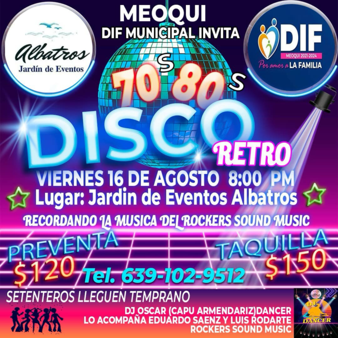 Este viernes en Meoqui, se llevará a cabo el Baile Retro por parte del DIF Municipal, en el Salón Albatros a partir de las 8 de la noche, donde los meoquenses podrán disfrutar de buena música de los 70´s y 80´s esto para recaudar fondos para la reubicación de la UBR (Unidad Básica de Rehabilitación) a las instalaciones del DIF.