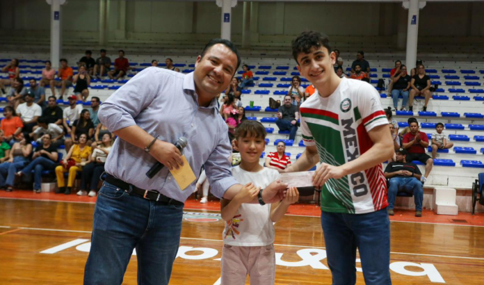 Durante el medio tiempo del partido de basquetbol estatal de playoffs entre Pioneros e Indios, el alcalde Jesús Valenciano García realizó la entrega de un apoyo económico al joven deportista José María Núñez López, quien representará a la región Centro Sur en campeonatos mundiales de Kick Boxing y Muay Thai.