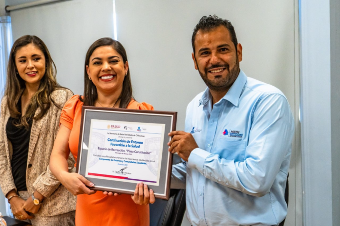 La alcaldesa Miriam Soto recibió la quinta certificación para el Meoqui parte de la Secretaria de Salud de Gobierno del Estado, ahora como como Municipio Promotor de la Salud y Entorno Recreativo de la Plaza Constitución, mismas que se suma a los reconocimientos como Espacio Libre de Humo de Tabaco de la Presidencia Municipal, Entorno Saludable en la Comunidad de El Torreón y el Albergue de Jornaleros Agrícolas de Lázaro Cárdenas, esto gracias al trabajo coordinado entre Gobierno e instancias como los Centros de Salud, CAPA, Cruz Roja, entre otros.