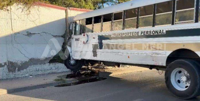 Un camión de transporte de personal se impactó contra una barda en la Avenida Tecnológico y Barranco Azul sin que se registraran lesionados.