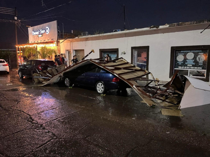 En la avenida Octava poniente entre las calles 5ta y 6ta, debido a los fuertes vientos, el tejaban de un domicilio cayó encima de un auto que se encontraba estacionado causándole cuantiosos daños materiales.