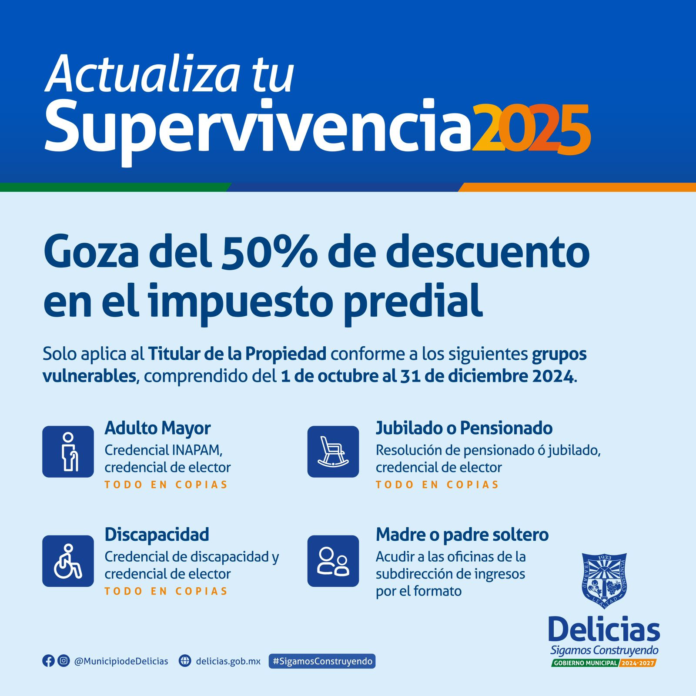 El jefe de Ejecución Fiscal de Delicias, Eduardo Jurado, hizo un llamado a la ciudadanía para participar en la actualización de supervivencia 2025, proceso que permitirá a los contribuyentes obtener un 50 por ciento de descuento en el impuesto predial. La campaña, dirigida a los grupos vulnerables de la ciudad, se llevará a cabo del 2 de octubre al 31 de diciembre.