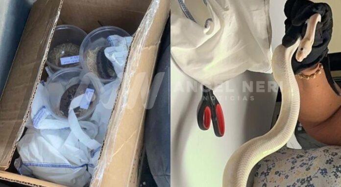 Ahí detectaron cajas de cartón en el asiento trasero; en las cuales había pequeñas bolsas de tela y recipientes de plástico transparentes, en los que a simple vista se apreciaban diferentes especies de reptiles vivos.