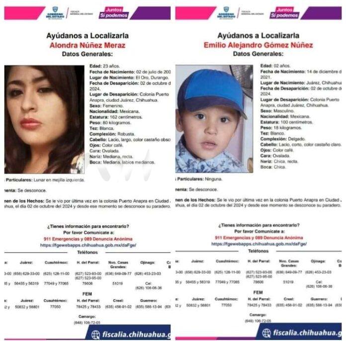 la fiscalía general del estado lanzó pesquisas para localizar Alondra Núñez Meraz , de 23 años de edad y a su hijo emilio Alejandro Gómez Núñez, de 2 años de edad