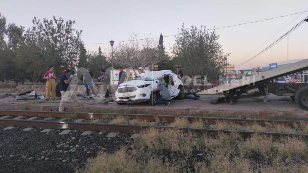 Un trágico accidente cobró la vida de dos jóvenes la madrugada de este domingo en el cruce de la avenida Ferrocarril Norte y la avenida Tecnológico, cuando un Ford Figo, color blanco, modelo 2016, fue impactado por el tren que circulaba de norte a sur, dejandolo volcado al lado de las vías, con graves daños en su costado derecho.