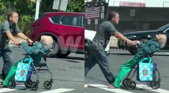En el video, se ve a un hombre con un aspecto algo oriental, caminando tranquilo por el paso peatonal mientras en una andadera lleva recostada a una mujer de la tercera edad con un aspecto extraño.