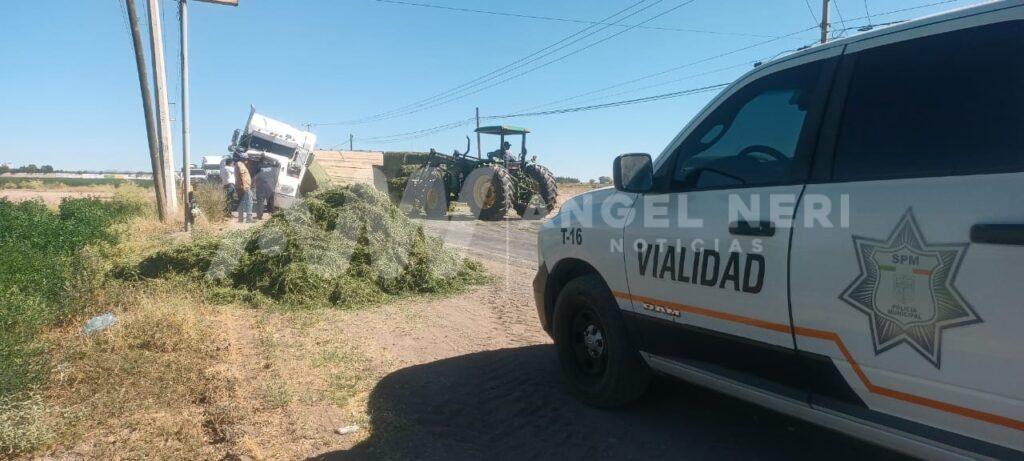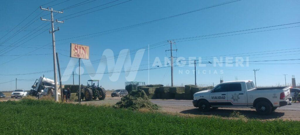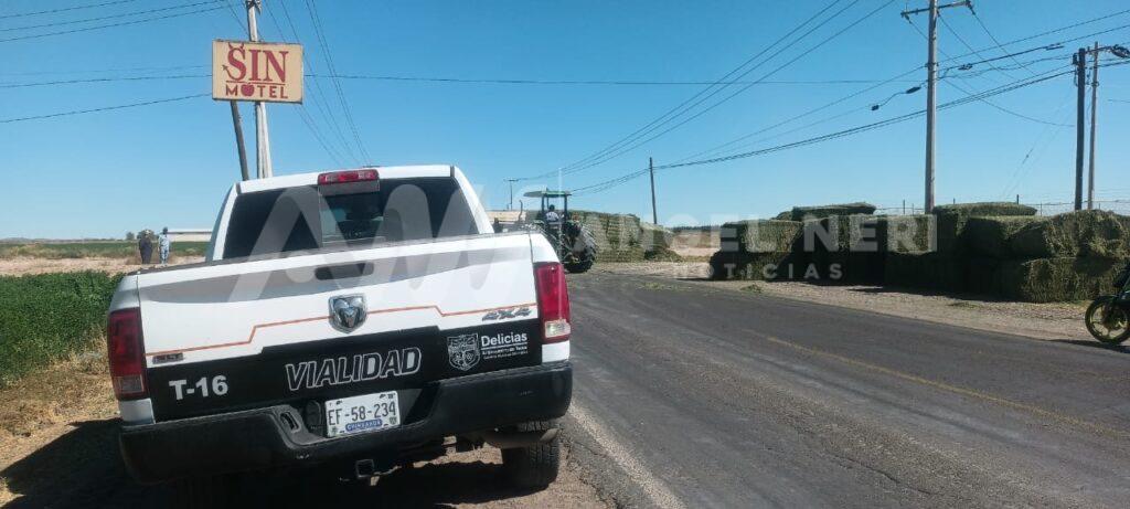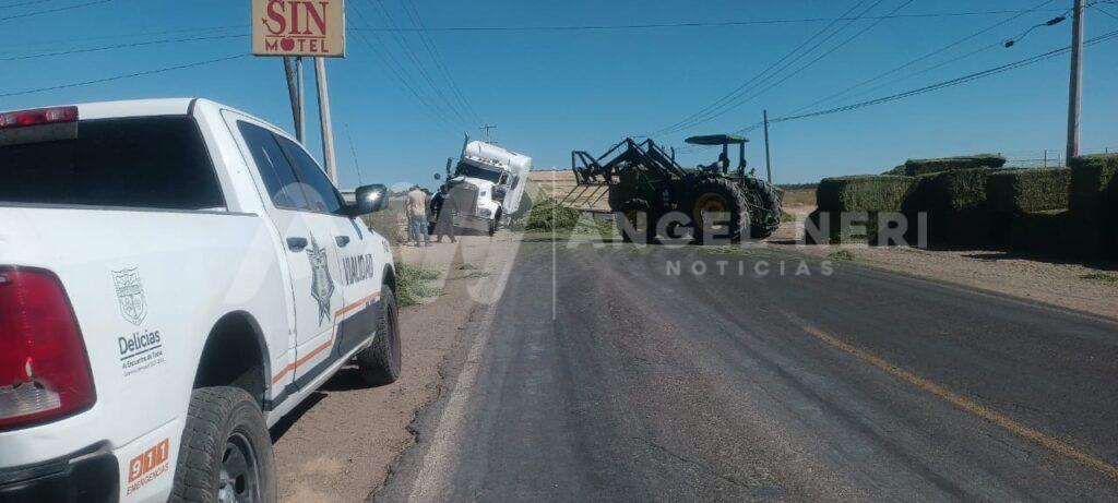 Un accidente vial ocurrido en el tramo entre las colonias Vicente Guerrero y la Abram González «La Quemada», sobre el camino que conecta Delicias y la comunidad de Orranteño, generó caos y tensión entre los conductores, pues los hechos ocurrieron cuando un tráiler de quinta rueda con plataforma, cargado de pacas, intentaba incorporarse a la vía principal desde un camino de terracería.