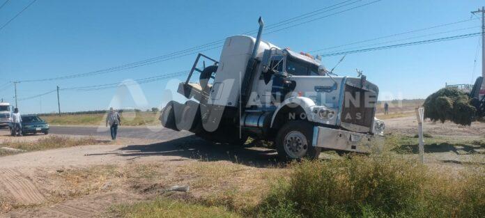 Un accidente vial ocurrido en el tramo entre las colonias Vicente Guerrero y la Abram González «La Quemada», sobre el camino que conecta Delicias y la comunidad de Orranteño, generó caos y tensión entre los conductores, pues los hechos ocurrieron cuando un tráiler de quinta rueda con plataforma, cargado de pacas, intentaba incorporarse a la vía principal desde un camino de terracería.