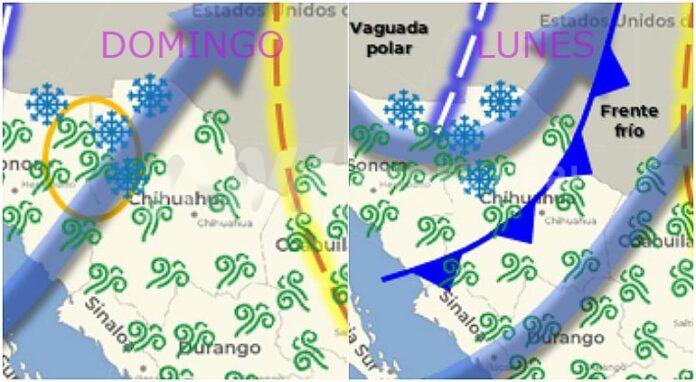 El domingo, esperan el SMN en el estado de Chihuahua temperaturas mínimas de -10 a -5°C con heladas, intervalos de chubascos con lluvias puntuales fuertes (25 a 50 mm), viento con rachas de 80 a 100 km/h y tolvaneras, así como posible caída de nieve o aguanieve.