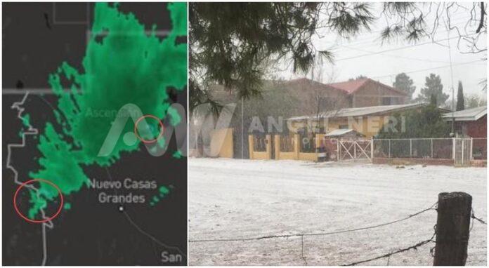 En la segunda imagen, de las 5:41 a.m. (hora del centro de México), el radar detecta menor cantidad de lluvias y presencia de nieve de forma más puntual en el norte de Ascensión y Janos.