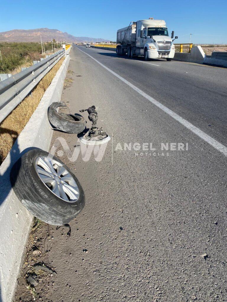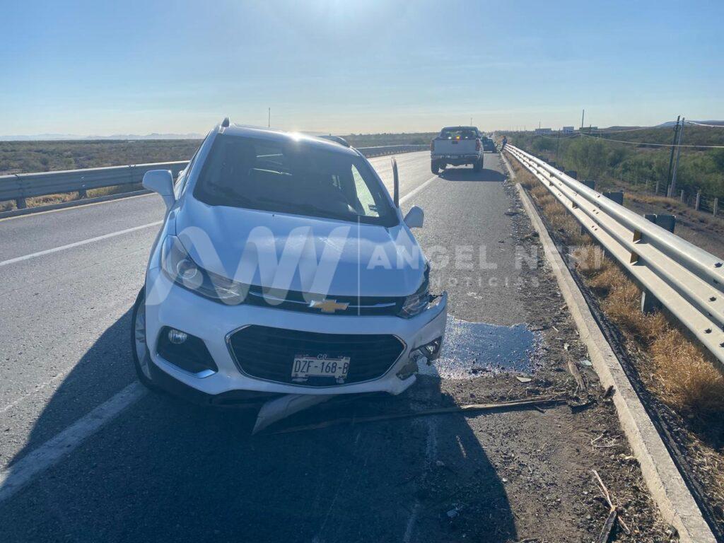 Esta mañana de martes se presento un accidente donde la conductora de un vehículo perdió el control al reventar un neumático y términó golpeándolo con el muro de contención esto sobre el kilómetro 171 de sur a norte carretera meoqui a Chihuahua dejando múltiples daños materiales de consideración en la camioneta marca Chevrolet trax en color blanco de modelo reciente placas DZF 168-B del estado de Chihuahua.