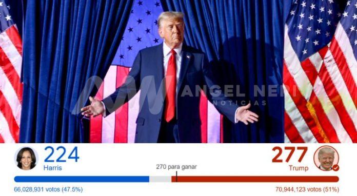 La agencia Associated Press (AP) expuso que Donald Trump consiguió 277 votos, que ya son más de los 270 necesarios para obtener la victoria. Su principal rival, Kamala Harris cuenta actualmente con 224 votos.