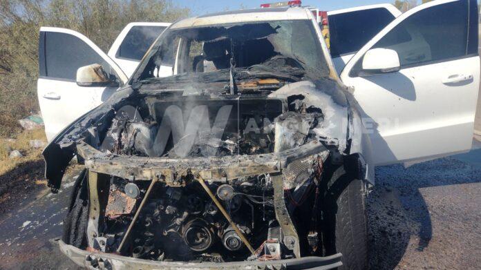Fue alrededor de las 12 p.m., cuando se solicitó el auxilio de las autoridades y de los Bomberos, pues el vehículo, una Dodge tipo Durango, color blanca, se encontraba envuelta en llamas, sin embargo, por fortuna el conductor y único tripulante logro salir ileso, aunque este último se perdio en su totalidad.