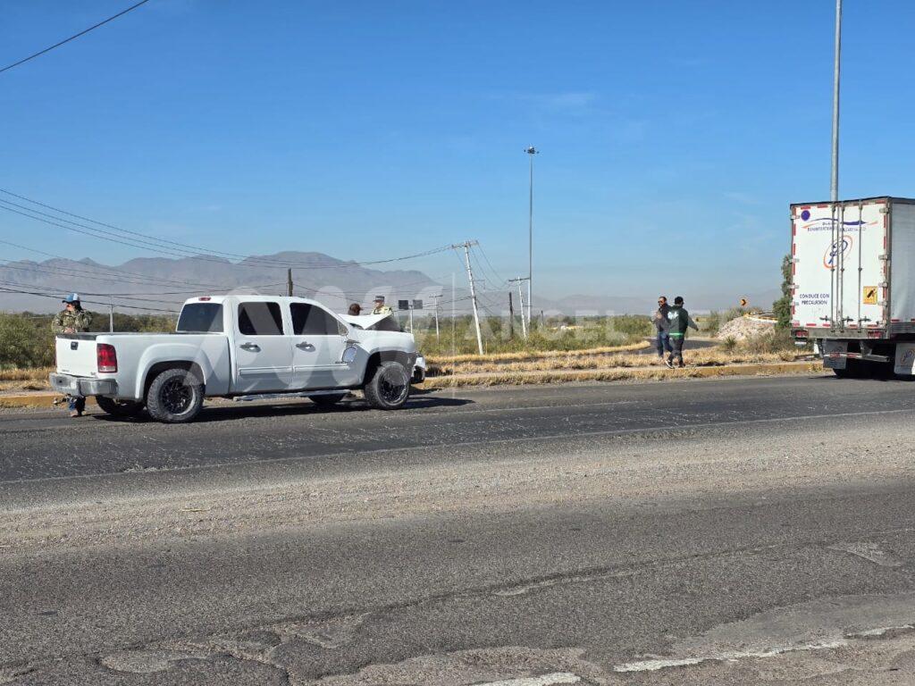 Este viernes por la mañana, un accidente vehicular dejó como saldo una camioneta destrozada al impactarse contra la caja de un tráiler en la carretera federal 45, a la altura del puente del Acceso Norte, cerca de las 11 a.m., siendo una camioneta GMC tipo Sierra, de doble cabina, color blanco, con placas DU-2451-B del estado de Chihuahua, la cual se desplazaba de sur a norte.