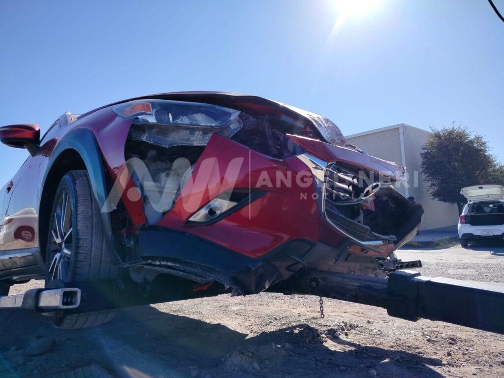 De acuerdo con el peritaje realizado por el Departamento de Vialidad, la Nissan, en color blanco, se desplazaba de sur a norte en sentido contrario y la colisión ocurrió cuando ambos vehículos coincidieron en el cruce, resultando en daños materiales estimados en 100 mil pesos aunque si bien la Nissan presentó daños menores, fue la Mazda, en color rojo, la que sufrió graves afectaciones en su defensa, parrilla, cofre y motor.