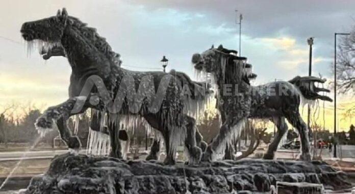 Debido a la helada de este miércoles que registró temperaturas de hasta -9º Celsius, el monumento de Los Indomables, amaneció congelado.