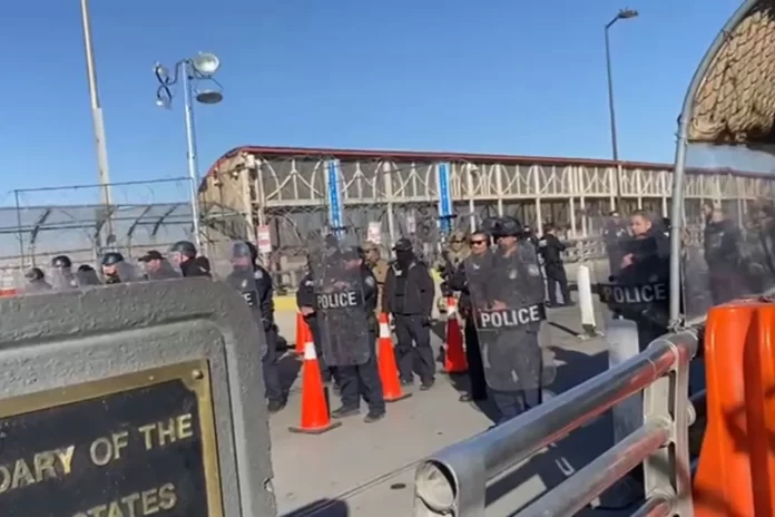 Agentes de la policía de Estados Unidos, con el respaldo de un grupo de antimotines, se instalaron en medio del puente y utilizaron altavoces para hacer un anuncio contundente: “Esto es una advertencia, esta es un área restringida federal. El personal no autorizado no puede pasar más allá de este punto, la entrada sin permiso dará lugar a la detención, procesamiento y posible aplicación de la fuerza.”
