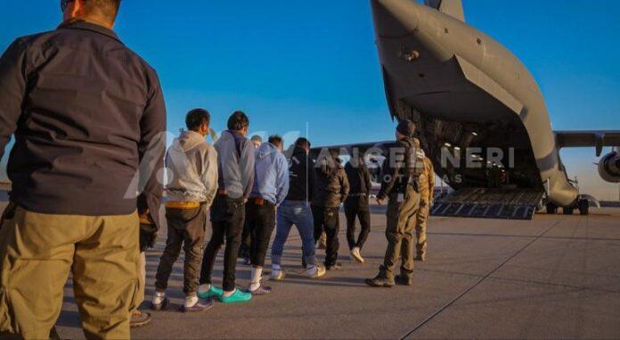 Los migrantes, que estaban bajo custodia de la Patrulla Fronteriza, fueron esposados y alineados antes de abordar los aviones militares. Se estima que son personas que recientemente cruzaron la frontera hacia Estados Unidos.